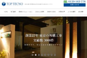 トップテクノは株式会社トップテクノが運営するエクステリア工事やガーデン工事の設計や施工、エクステリアやガーデングッズの販売を行うサービスです。東京都杉並区に本社が、埼玉県にトップテクノの支店があります。トップテクノでは見積りが無料です。また、3DCADを使用したパースをトップテクノでは制作してくれます。トップテクノの対応地域は東京全域です。