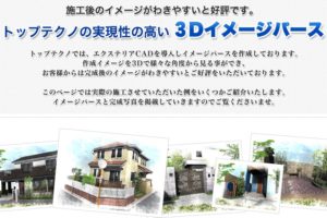 | 特徴 | トップテクノの特徴は、3DCADを使ってパースを制作してくれるところです。3Dイメージパースで、様々な角度から作成したデザインを確認できます。そのため、施工後のイメージがわきやすいです。 |